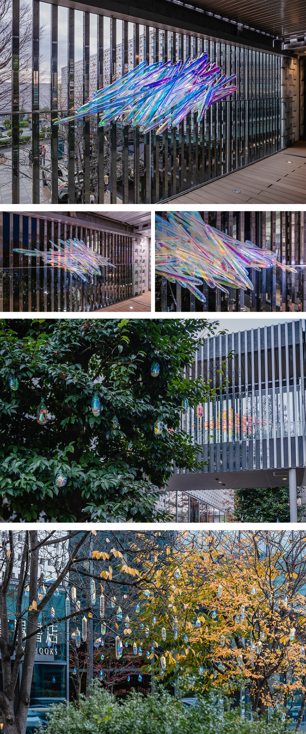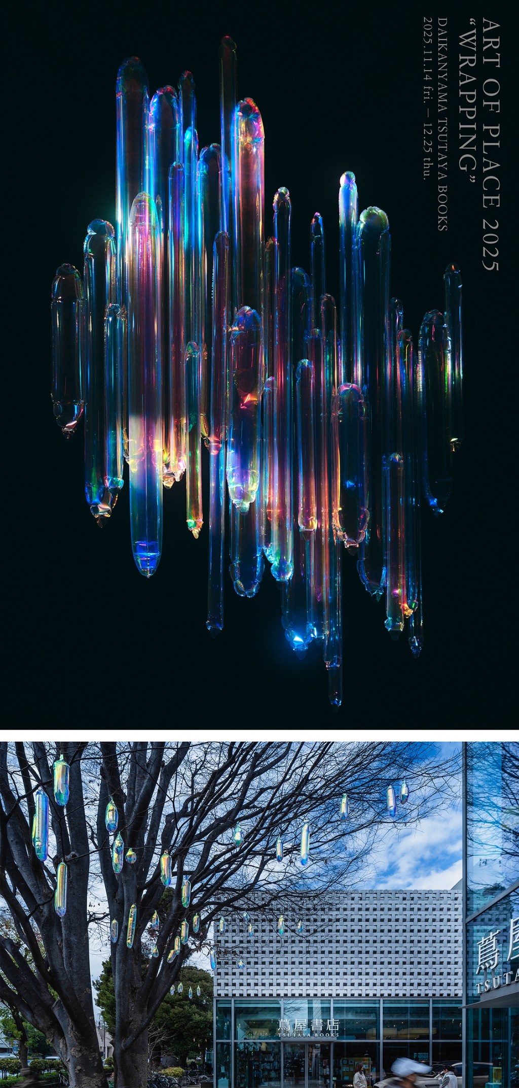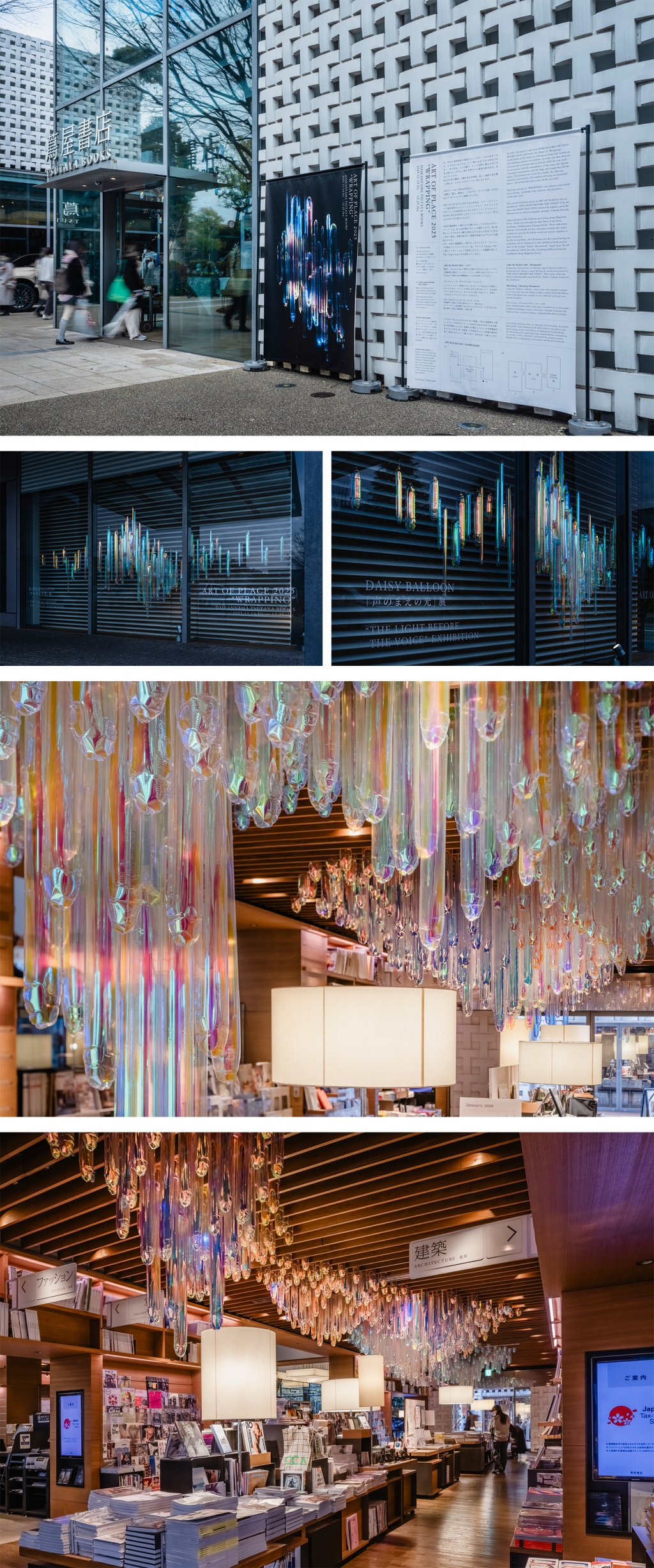 代官山 蔦屋書店1階の3つの棟にわたってのびるマガジンストリートに、約2,000個のバルーンが連なります。光の反射によってそれぞれで輝きを放ちながら交じり合おうと中心へ向かう姿は、言葉が紡がれ、物語を形成するプロセスを想起させます。 また、代官山 蔦屋書店2階のキッズフロアにワークショップで制作したクリスマスツリー、ラウンジ「Anjin」では、1階インスタレーションで使用したバルーンの残骸を用いた作品「Apple bear」を展示いたします。